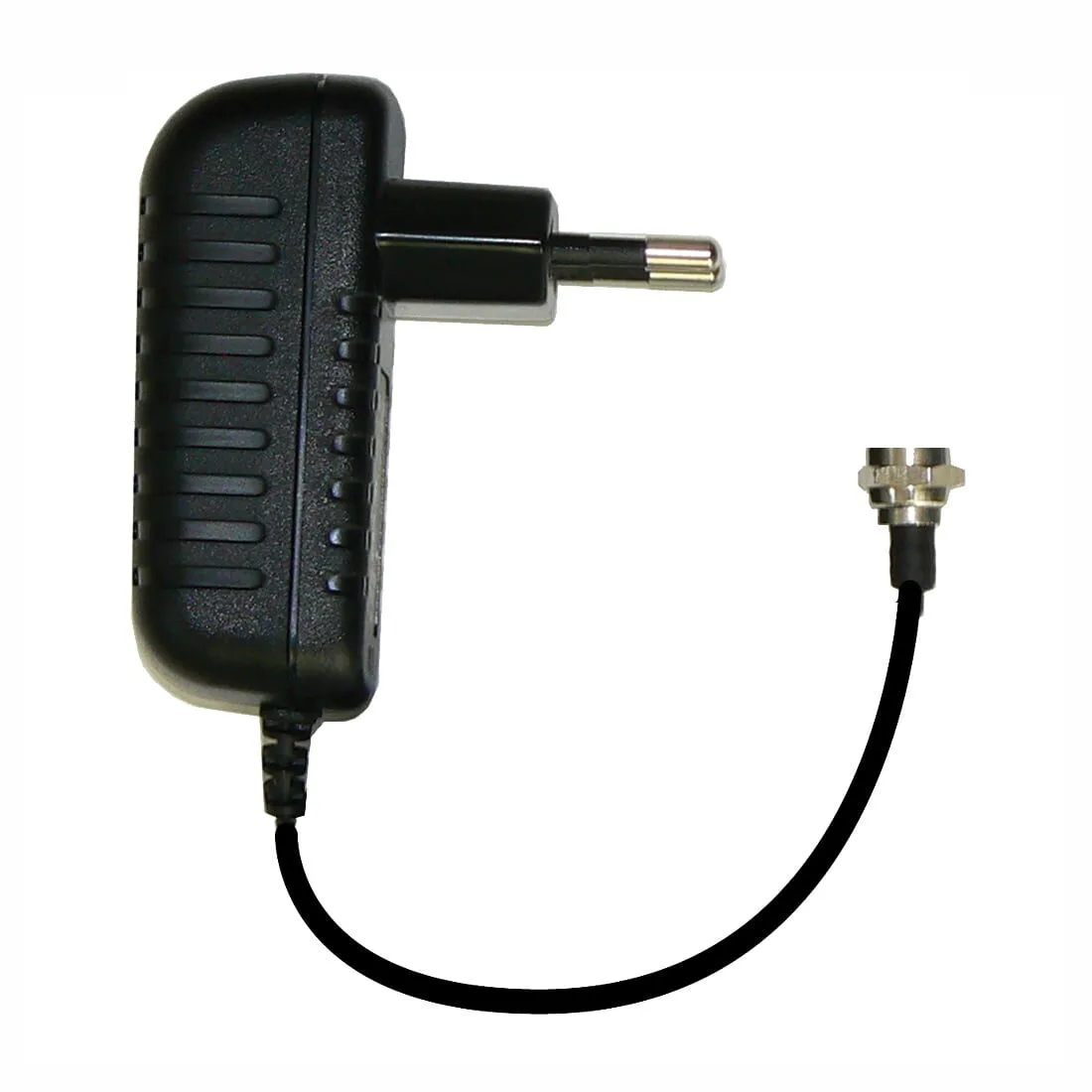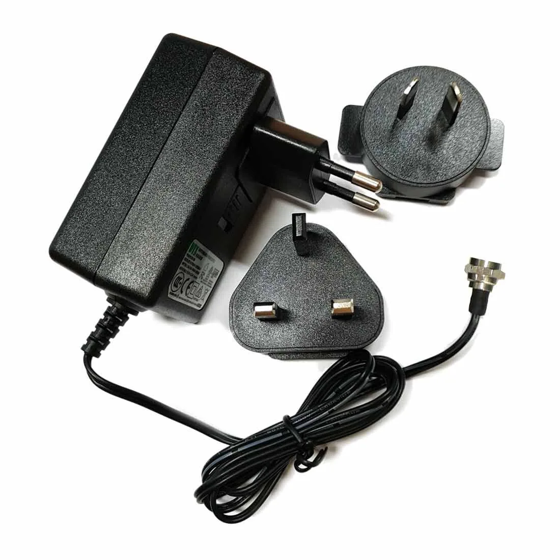 Fonte de alimentação 12V 1,5A com conector F macho e adaptadores para o padrão de plugue de diferentes países .