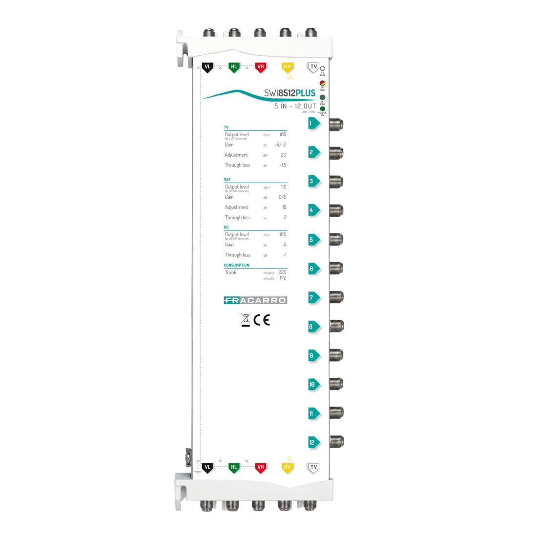 Multiswitch em cascata de 5 entradas com 32 derivações de saída ; ganho ativo e ajuste separado de ganho de TV e satélite (independente para bandas baixas e altas). Chassi acoplado .
